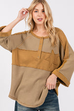 This stylish top features a star applique patch and exposed seams for a trendy look. The waffle knit fabric adds texture and dimension to the design. Perfect for casual outings or adding a cool touch to your everyday wardrobe. The unique details make this top stand out and capture attention. Pair it with your favorite jeans or leggings for a chic and comfortable ensemble. A versatile piece that can easily be dressed up or down depending on the occasion.