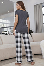Number of pieces: Two-piece Pattern type: Plaid Style: Casual Features: Tie, Buttoned Neckline: V-neck Length: Long Sleeve length: Short sleeves Sleeve type: Regular sleeves Sheer: No Material composition: Top: 60% polyester, 35% viscose, 5% elastaneBottoms:...