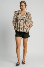 A ruffled tie neck puff sleeve babydoll blouse is a stylish and feminine top that features a ruffled neckline with a tie detail, puff sleeves, and a loose, flowy silhouette that cinches at the waist. This type of blouse is great for adding a touch of elegance and charm to any outfit, whether paired with jeans for a casual look or dressed up with a skirt for a more formal occasion. The babydoll style is flattering on many body types and is perfect for creating a relaxed, bohemian-inspired look.