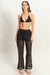 This elegant beach cover up set features a sophisticated black crochet design. The top piece is styled as a classic triangle bikini top with halter ties, while the bottom features fashionable wide-leg pants with a comfortable drawstring waist. The intricate crochet pattern provides a semi-sheer effect that's perfect for beach or poolside wear. Made from quality knit material that offers both style and comfort, this set can be easily paired with swimwear or casual wear for a versatile beach-to-street look. The breathable fabric and relaxed fit make it an ideal choice for warm weather and resort destinations.