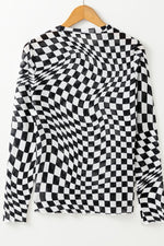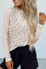 Checkered Mock Neck Long Sleeve Blouse
