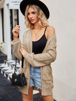 Pattern type: Solid Style: Casual Features: Pocketed Neckline: Open front Length: Regular Sleeve length: Long sleeves Sleeve type: Regular sleeves Material composition: 100% acrylic Stretch: Slightly stretchy Care instructions: Machine wash cold. Tumble dry low....