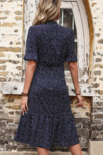 Type: Casual dresses Sizing category: Regular Picture style: Outdoors Pattern type: Polka dot Style: Casual, chic, minimalist, vacation Features: Ruffle Neckline: V-neck Length: Midi Sleeve length: Short sleeves Sleeve type: Flounce sleeves Material: 100% polyester...