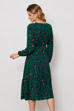 Pattern type: Printed Style: Classy, chic Features: Ruffle Neckline: Surplice Length: Midi Sleeve length: Long sleeves Sleeve type: Balloon sleeves Hem shaped: A-line Sheer: No Body: Not lined Material composition: 100% polyester Stretch: No stretch...